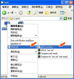 于「我的电脑」内,选择你要压缩的档案,右击滑鼠,选择「WinRAR」-> 「Add to archive」。2.