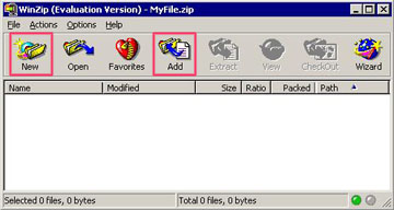 请先开启 WinZip 程式,再按「New」,输入新压缩档的名称后,按「OK」,再选择你要压缩的档案,亦可再按「Add」选择其他要压缩的档案。或