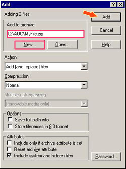 在弹出的视窗内,你可按「New」选择新压缩档的路径,并输入新压缩档的名称,再按「Add」。